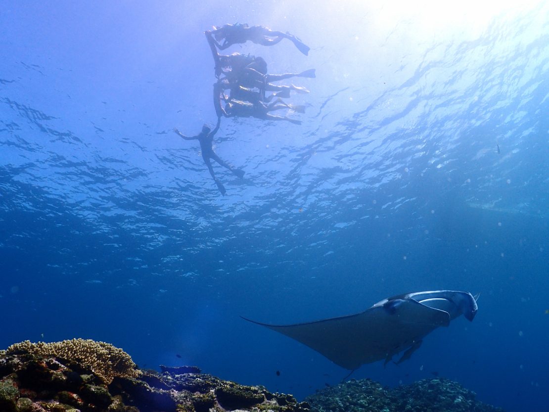 Hotel Departure (around 8:00am) ⇒ Depart from port (around 9:00am) ⇒ Arrive at a phantom island (around 9:30am) ⇒ Introductory Scuba Diving at a coral reef point (around 10:30am) ⇒ Lunch (around 12:00) ⇒ Depart for Manta Point (around 1:00pm) ⇒ Snorkeling at manta point ⇒ Return to port (around 4:00pm) ⇒ Arrive at hotel (around 4:30pm)