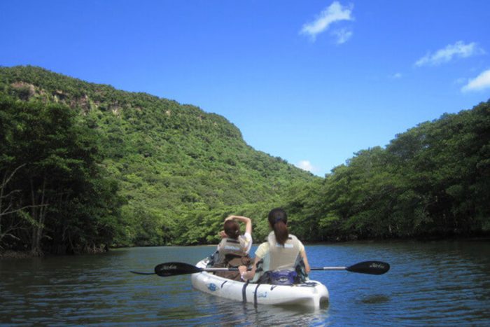 石垣港出發(8:00) ~ 抵達西表島上原港(8:50)= 報到處(準備・獨木舟教學)‥ 紅樹林獨木舟(約30分鐘) ~ 叢林健行(約30分鐘)‥ Sangara瀑布(玩水・午餐)‥ 叢林健行(約30分鐘)‥ 紅樹林獨木舟(約30分鐘)‥ 報到處(淋浴・更衣)= 上原港出發(14:30)~ 抵達石垣港(15:20)