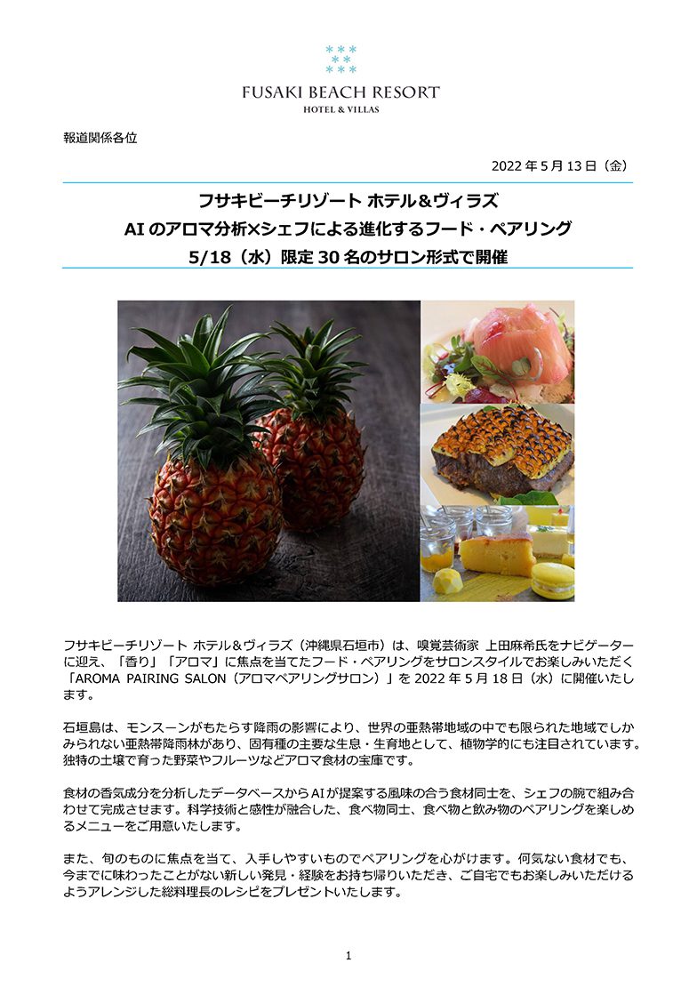 フサキビーチリゾート ホテル&ヴィラズ(沖縄県石垣市)は、嗅覚芸術家 上田麻希氏をナビゲーターに迎え、「香り」「アロマ」に焦点を当てたフード・ペアリングをサロンスタイルでお楽しみいただく「AROMA PAIRING SALON(アロマペアリングサロン)」を2022年5月18日(水)に開催いたします。