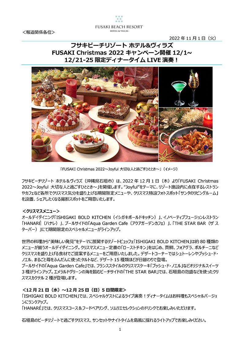 フサキビーチリゾート ホテル&ヴィラズ(沖縄県石垣市)は、2022年12月1日(木)より「FUSAKI Christmas 2022~Joyful 大切な人と過ごすひととき~」を開催します。”Joyful”をテーマに、リゾート施設内に点在するレストランやカフェなど各所でクリスマス気分を盛り上げる期間限定メニューや、クリスマス特設フォトスポット「サンタのリビングルーム」を設置、シェアしたくなる撮影スポットをご用意いたします。