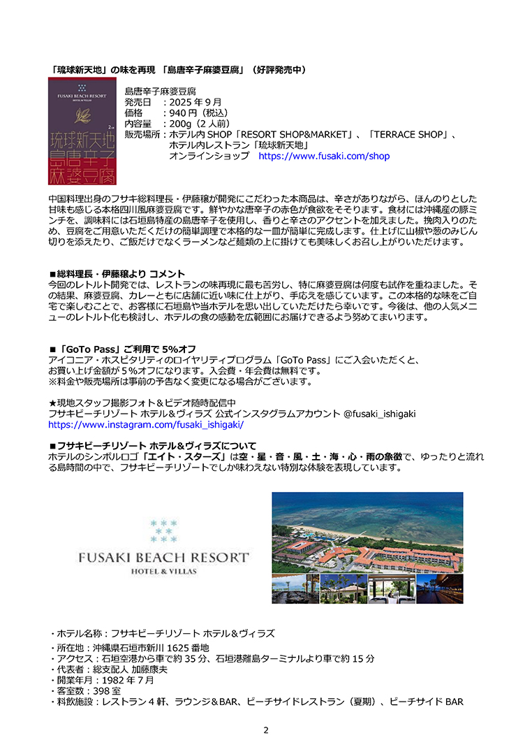 フサキビーチリゾート ホテル&ヴィラズ(所在地:沖縄県石垣市、総支配人:加藤康夫、以下当ホテル)は、ホテルレストランの味を家庭で楽しみたいというお客様の声にお応えし、フサキオリジナル商品として初となるレトルト食品の販売を開始いたしました。