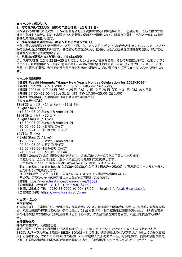【NEWS RELEASE】月夜、星降る夜、波音と音楽 — フサキビーチリゾートで過ごすクリスマスと新春 —