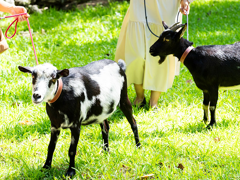 心地よい風の中、動物たちとおさんぽ:愛らしいヤギとリゾート内を歩く「おさんぽ体験」は子供たちに大人気。風が心地よいこの季節なら、動物たちものんびりリラックス。旅のアルバムに、とびきりキュートな一枚を。