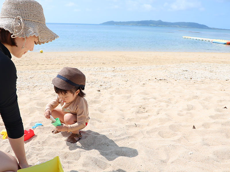 砂浜は、巨大な砂場!:暑すぎない冬のビーチは、実は小さなお子様の砂遊びに最適。「見て!きれいな貝殻!」波音をBGMに、真っ白な砂浜で大きな砂のお城を作ったり、サンゴのかけらを探したり。時間を忘れて夢中になれる、天然のプレイパークです。