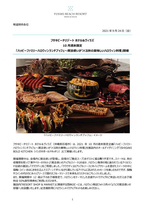 フサキビーチリゾート ホテル&ヴィラズ(沖縄県石垣市)は、2021年10月の週末限定企画「ハッピーファミリー ハロウィンランチブッフェ〜魔法使いがつくる秋の美味しいハロウィン料理」を施設内のオールデイダイニング「ISHI[..もっと読む]