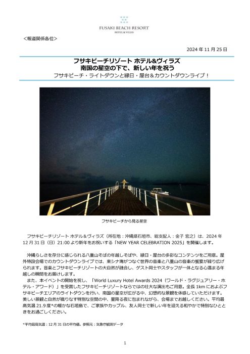 フサキビーチリゾート ホテル&ヴィラズ(所在地:沖縄県石垣市、総支配人:金子 宏之)は、2024年12月31日(日)21:00より新年をお祝いする「NEW YEAR CELEBRATION 2025」を開催します。 沖縄[..もっと読む]