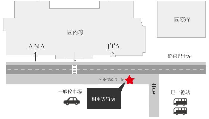 請於機場正門出口處,穿越停車場方向的斑馬線後向左行進,即可抵達日產租車接駁巴士候車處,敬請於該處等候。