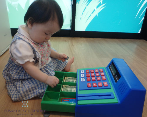 音の出る玩具やボールや車、レジに自ら手を伸ばして遊び始めました♪